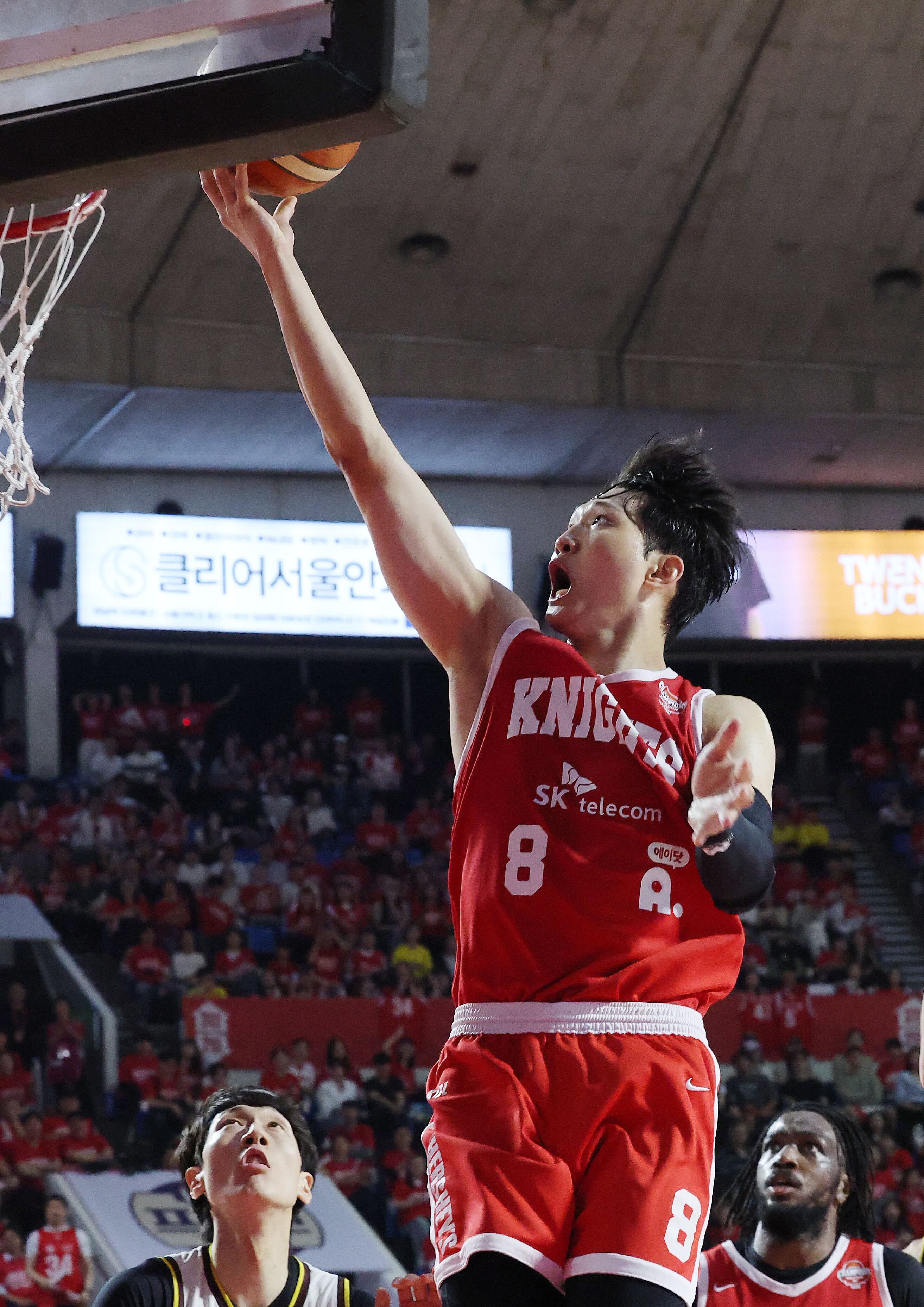 13일 오후 서울 송파구 잠실학생체육관에서 열린 '2024-25 KCC 프로농구 챔피언결정전 5차전' 창원 LG 세이커스와 서울 SK 나이츠의 경기에서 SK 안영준 골밑 슛을 하고 있다. 2025.5.13/뉴스1 ⓒ News1 박세연 기자 |