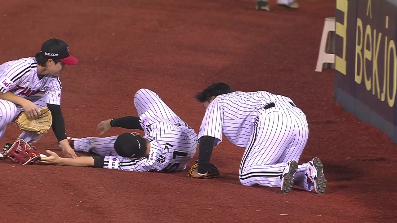 홍창기는 그제(13일) 키움전 9회말 수비 도중 뜬공을 잡으려다 1루수 김민수와 충돌한 뒤 왼쪽 무릎에 통증을 호소하며 쓰러졌습니다.
