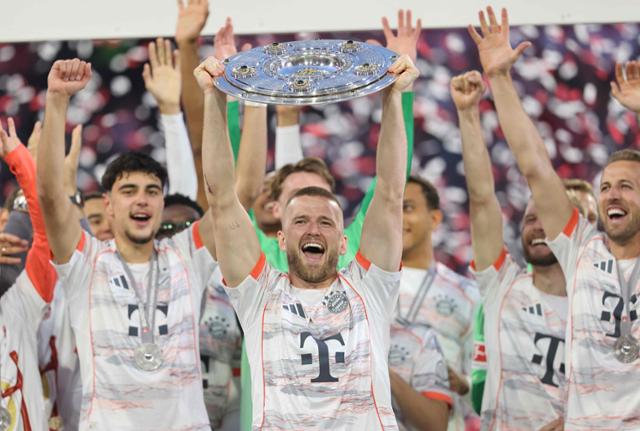 바이에른 뮌헨의 에릭 다이어(가운데)가 지난 10일(현지시간) 독일 뮌헨 알리안츠 아레나에서 동료들과 함께 우승 트로피를 들어올리며 환호하고 있다. 뮌헨=AFP 연합뉴스 |