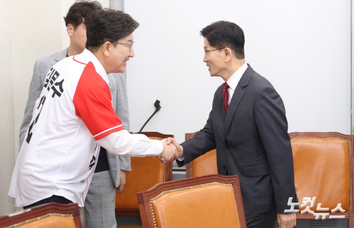 국민의힘 김문수 대선 후보와 권성동 공동선대위원장이 15일 서울 국회에서 열린 '중앙선대위 회의 및 중앙선대위 임명장수여식'에 참석하며 인사를 하고 있다.