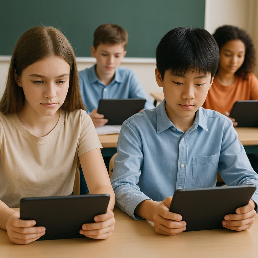 한 교실에서 학생들이 인공지능(AI) 교과서를 활용해 학습하는 모습(사진=생성형AI 서비스) |
