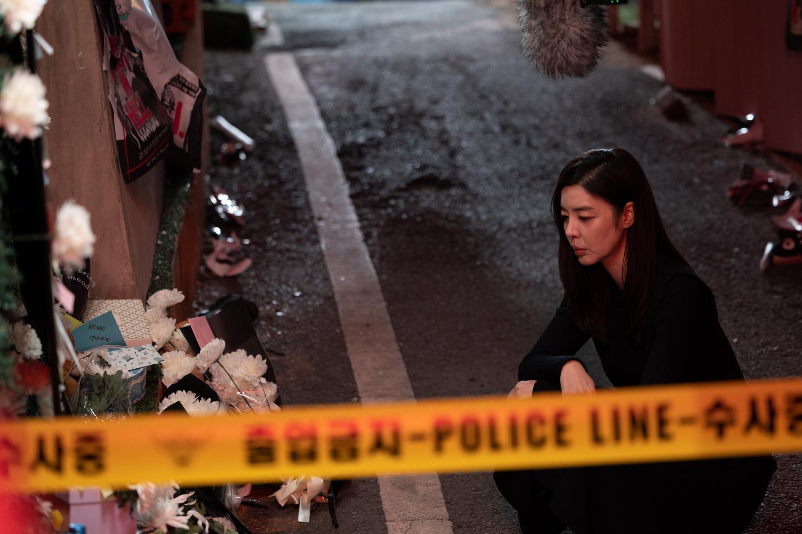 먼저, 첫 번째 스틸은 여주인공 '윤지희' 역을 맡은 배우 김규리가 폴리스라인이 쳐진 참혹한 사건 현장에 홀로 앉아 있는 모습이다. 공허하면서도 어딘가를 응시하는 그녀의 눈빛은 앞으로 펼쳐질 비극과 그녀가 가진 비밀에 대한 호기심을 자극한다. 과연 그녀는 이 사건과 어떤 관련이 있는 것일까.