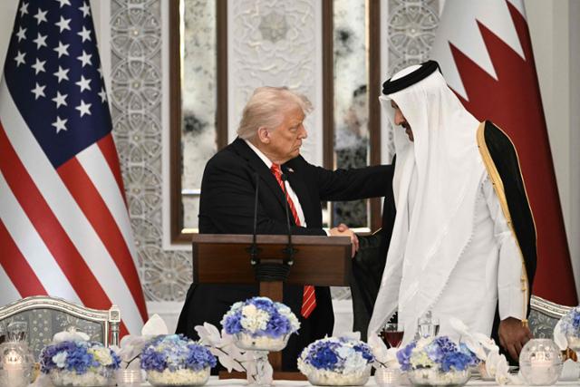 도널드 트럼프(왼쪽) 미국 대통령이 14일 카타르 루사일의 루사일궁에서 열린 국빈만찬에 참석해 자리를 마련한 셰이크 타밈 빈 하마드 알사니 카타르 군주(에미르)와 악수하고 있다. 루사일=AFP 연합뉴스 |
