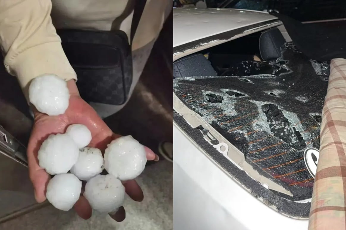 중국 수도 베이징에 쏟아진 계란 크기만한 우박(왼쪽)과 피해를 입은 차량. /중국 소셜미디어
