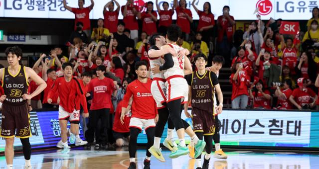서울 SK 선수들이 15일 경남 창원체육관에서 열린 2024~25 프로농구 챔피언결정전 6차전에서 창원 LG에 승리를 거둔 후 기뻐하고 있다. 창원=뉴시스 |