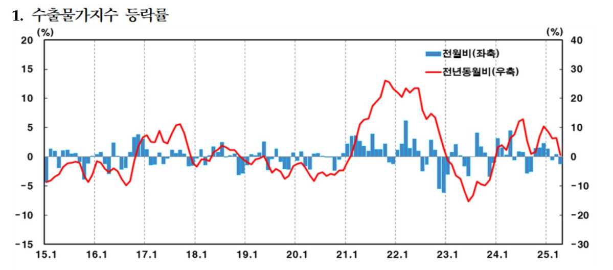 수출물가지수는 원·달러 환율이 하락한 가운데 화학제품, 석탄및석유제품 등이 내린 영향을 받았다. 지난달 원·달러 환율 평균 환율은 1444.31원으로 전월(1456.95원)보다 0.9% 하락했다.