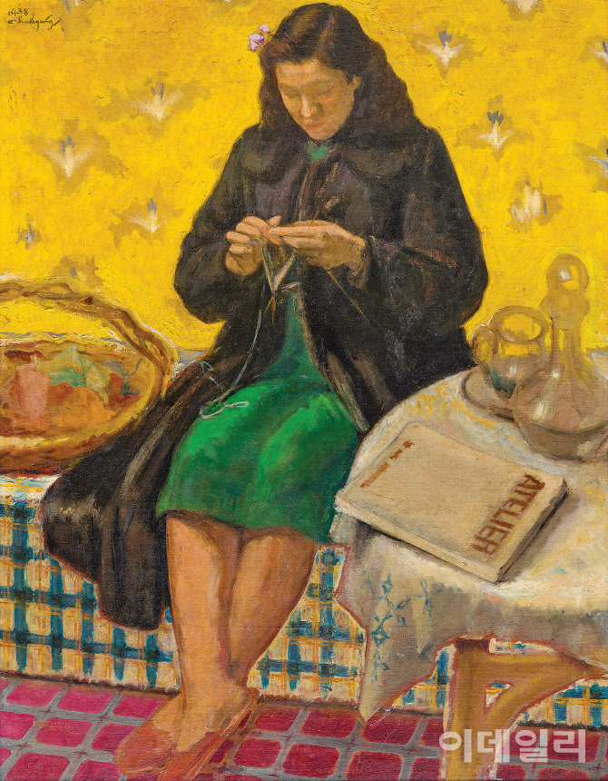 주경의 ‘뜨개질’(1938). 일본 유학에서 배우고 익힌 서양화 기법을 충직하게 따랐다. 뜨개질하는 여인이 테마지만 정작 시선을 끄는 건 여인의 주변이다. 여인이 입은 검은 코트와 초록 원피스, 여인 뒤의 노란 벽지, 여인이 봤을 외국잡지까지. 어릴 때부터 일찌감치 터득한 서양 신문물을 자연스럽게 녹여냈다. ‘제20회 조선미술전람회’(1941)에서 입선한 작품이다. 여인을 실내에 앉힌 도상이 1930∼1940년대 ‘조선미술전람회’에서 유행했다지만 작가의 작업은 그보다 멀리 나갔다. 지난 5월 1일 국립현대미술관 과천에서 개막한 ‘MMCA 과천 상설전: 한국근현대미술Ⅰ’에 걸렸다. 캔버스에 유화 물감, 116×91㎝. 국립현대미술관(이건희컬렉션) 소장. |
