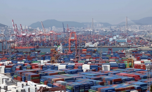 12일 부산 남구 신선대(사진 아래) 및 감만(위) 부두 야적장에 수출입 컨테이너가 가득 쌓여 있다. 뉴시스 |