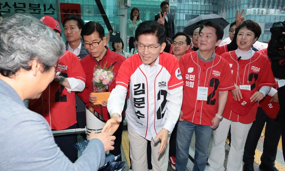 김문수 국민의힘 대통령 후보가 판교역 유세를 시작으로 16일 선거운동을 시작했다. 비가 내리는 바람에 김 후보를 비롯한 선거운동원들이 판교역 출구 앞에 밀집하자 출근하는 시민들은 “길 좀 터달라”며 불편함을 호소했다. 일부 지지자들은 김 후보에게 ‘5·18 광주 민주화운동 행사에 참석하지 말라’고 요구했다. 윤석열 전 대통령 출당 권유를 한 김용태 비상대책위원장를 “내보내라”고 한 시민도 있었다.