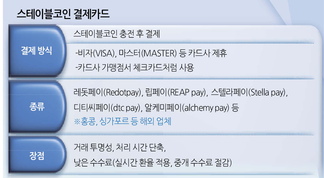 ▶레돗·스텔라·립페이 등 스테이블코인카드…카드사와 제휴 가맹점서 결제=결제 서비스를 제공하는 해외 업체는 홍콩, 싱가포르 등에 기반을 둔 레돗페이, 립페이(REAP pay), 스텔라페이(Stella pay), 디티씨페이(dtc pay), 알케미페이(alchemy pay) 등이 있다. 이들이 서비스를 제공하는 방식은 큰 틀에서 유사하다. 글로벌 카드사와 제휴해 해당 가맹점에서 결제되는 식이다. 업체 대부분은 미국 카드사 비자(VISA), 마스터(MASTER)와 제휴하고 있다.