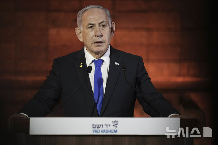 [예루살렘=AP/뉴시스] 베냐민 네타냐후 이스라엘 총리가 지난 4월23일(현지 시간) 예루살렘 야드 바솀 홀로코스트 추모관에서 열린 홀로코스트 추모 행사에서 연설하고 있다. 2025.05.16. |