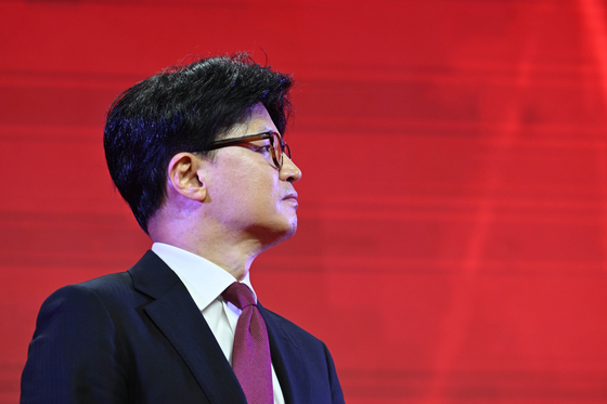 한동훈 전 국민의힘 대표가 지난 3일 경기 고양시 킨텍스에서 열린 국민의힘 전당대회에서 대선 후보로 선출된 김문수 후보의 수락 연설을 지켜보고 있다. 〈사진=공동취재, 연합뉴스〉 |