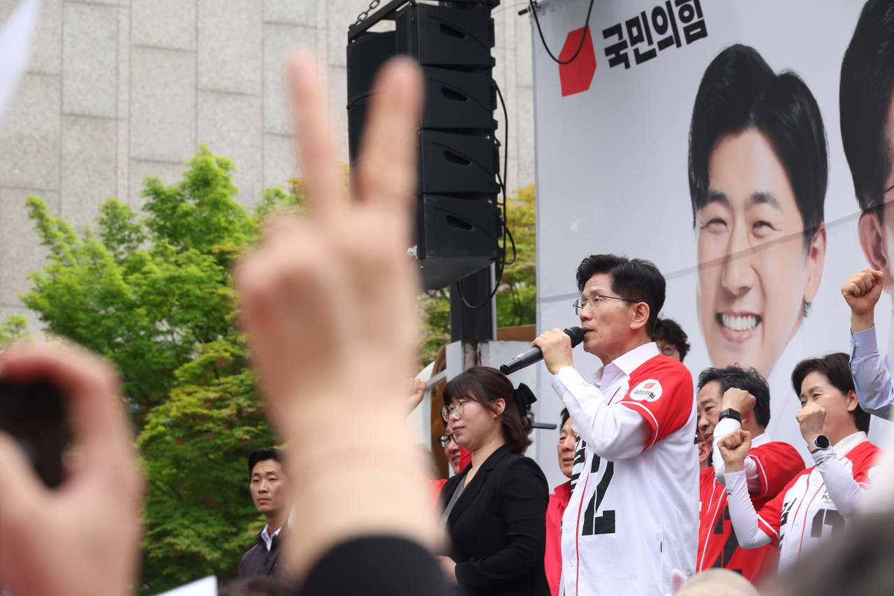 김문수 국민의힘 대선 후보가 16일 충남 천안시 신세계백화점 앞에서 유세를 하고 있다. [공동취재] |