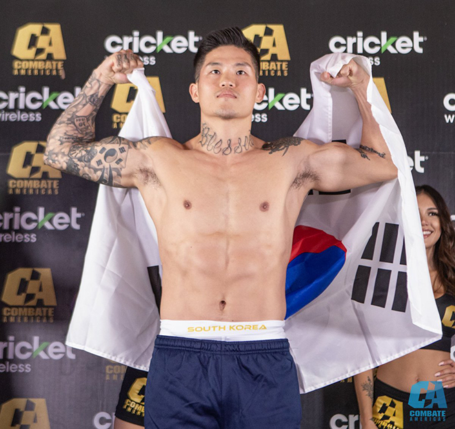 박원식이 2018년 11월 콤바테 멕시코 몬테레이 대회 계체 통과 후 태극기와 함께 기념 촬영을 하고 있다. 사진=Combate Global |