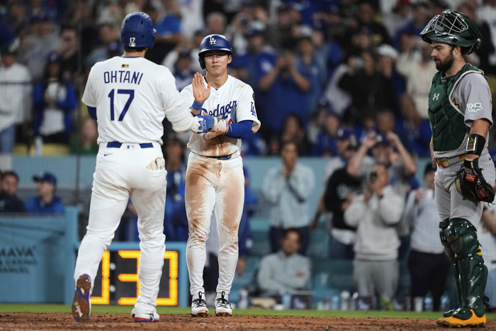 LA다저스의 김혜성이 16일 열린 애슬레틱스와 MLB 홈 경기에서 4회 홈런을 터트린 오타니 쇼헤이와 기쁨을 나누고 있다. AP연합뉴스 |