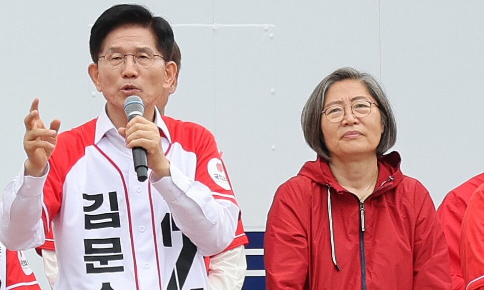 이수정 국민의힘 경기 수원정 당협위원장이 16일 오전 경기 화성시 동탄센트럴파크에서 김문수 국민의힘 대통령 후보가 유세하는 모습을 지켜보고 있다. 신소영 기자 viator@hani.co.kr |