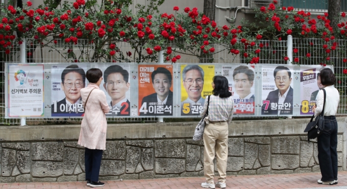 15일 오후 대구 중구 남산동의 한 아파트 울타리에 곱게 핀 장미꽃 아래 제21대 대통령 선거 후보자들의 벽보가 붙어있다. /사진=뉴스1. |