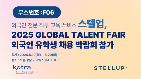 외국인 전문 인재 양성 기업 스텔업(대표 오민지)이 오는 19일부터 20일까지 코트라 주관 '2025 외국인 유학생 채용 박람회(Global Talent Fair)'에서 맞춤형 취업 컨설팅을 진행한다고 16일 밝혔다.