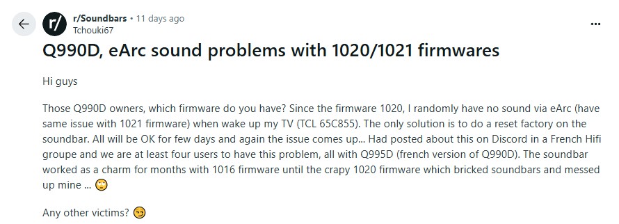 삼성전자는 최근 HW-Q990D에 펌웨어 1021.2를 OTA 업데이트로 배포한 바 있다. 레딧 및 국내 커뮤니티 사용자들은 "업데이트 후 HDMI eARC와 관련한 버그가 발생한 것 같다. 공장 초기화 등을 거치면 일시적인 개선이 있지만, 간혹 HDMI eARC가 인식되지 않는 증상이 발생한다"는 글을 작성했다.