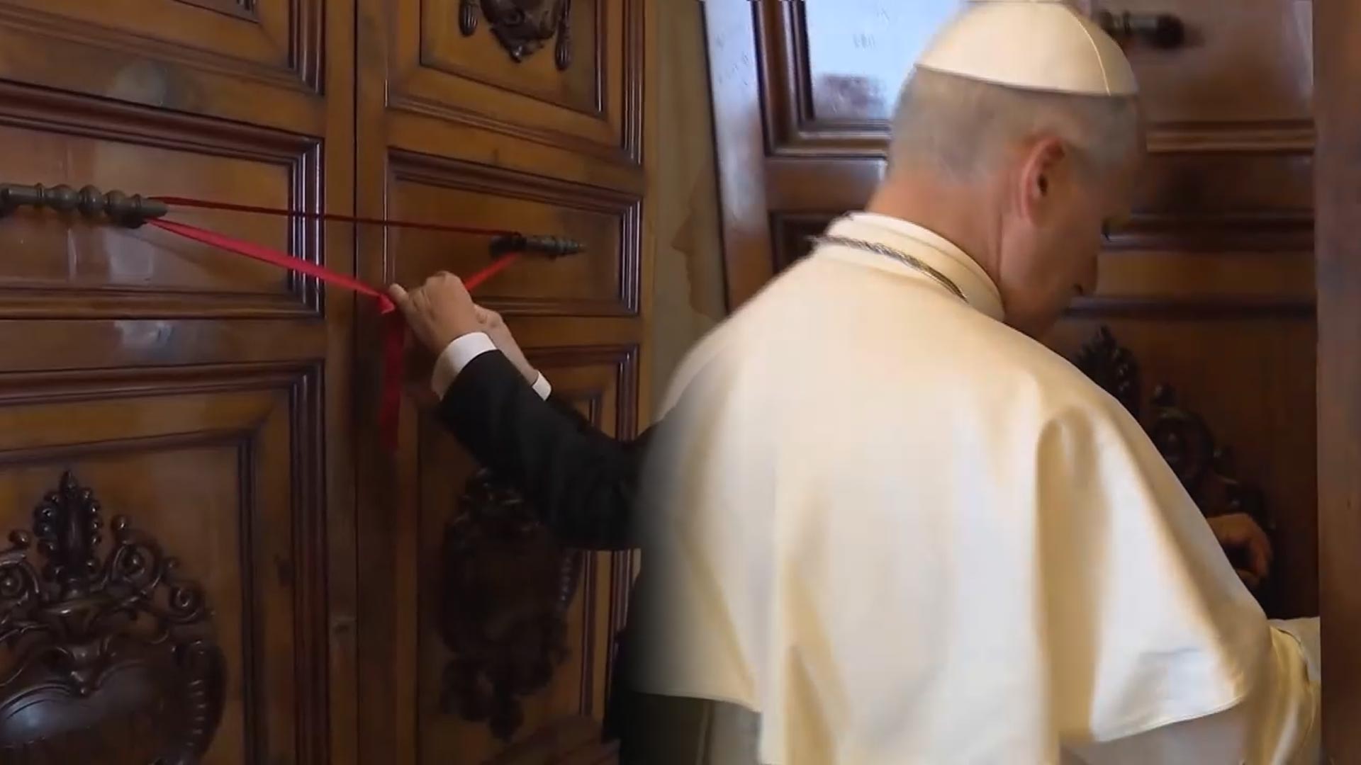 프란치스코 전 교황 선종으로 봉인됐던 관저 '사도궁'의 출입문 매듭이 풀리고, 레오 14세 교황이 직접 열쇠를 돌립니다.