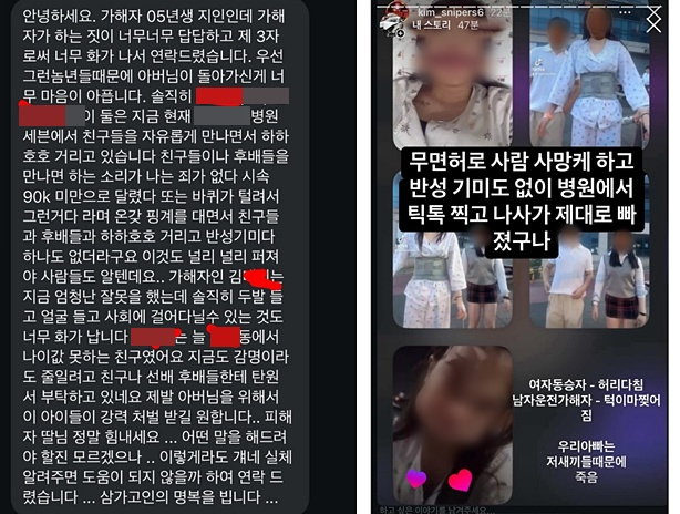 B씨는 "가해자들 하는 짓을 보니 제3자로서 너무 화가 나서 연락드렸다. 그런 애들 때문에 아버님이 돌아가신 게 마음이 아프다"고 말문을 열면서 병원 치료를 받는 가해자들의 언행을 전했다.