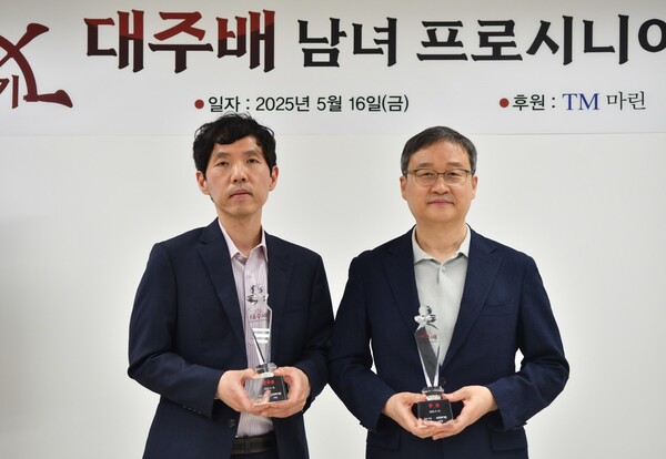 유창혁 9단(오른쪽)이 16일 열린 대주배 시니어 결승전에서 우승한 뒤 이창호 9단과 기념사진을 찍고 있다. 한국기원 제공 |