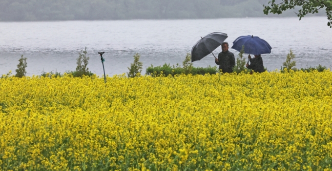비가 내린 지난 9일 경기 구리한강공원 일대에서 시민들이 우산을 쓰고 걸어가는 모습./사진=뉴스1 |