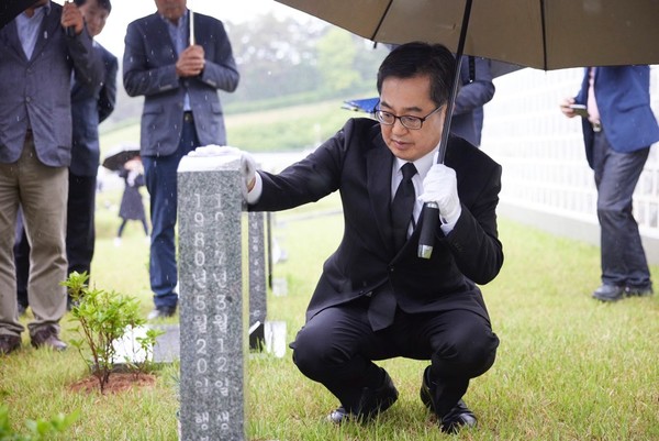 김 지사는 방명록에 '이제 당신이 나를 이뜰어 주시기 바랍니다. 오월 광주는 영원히 살아 있습니다'고 적고, 최상필 열사를 비롯한 경기도 출신 열사와 문재학 학생 열사 묘소 등에 헌화했다.
