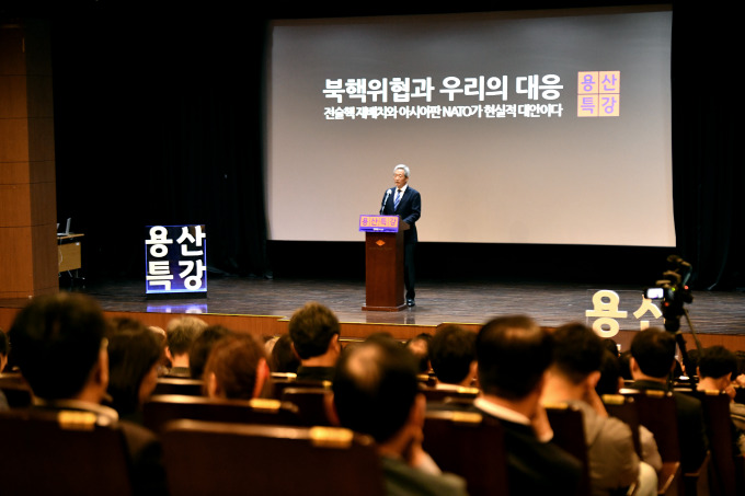 정몽준 아산정책연구원 명예이사장이 16일 오후 서울 용산 전쟁기념관에서 '북핵 위협과 우리의 대응' 주제의 전쟁기념사업회(회장 백승주) 초청 월례 '용산특강'을 하고 있다. [사진=전쟁기념사업회] |
