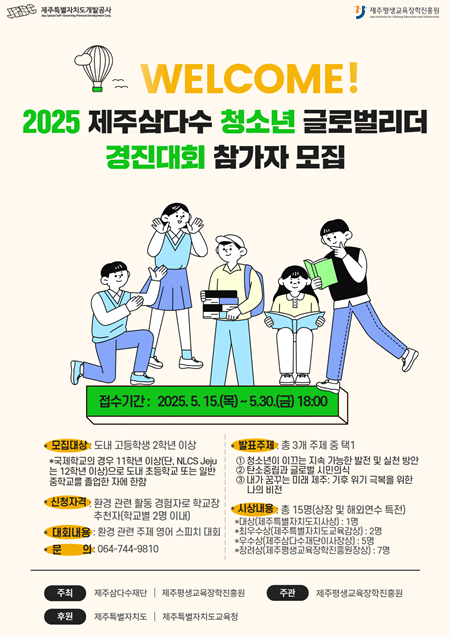 (제주=국제뉴스) 문서현 기자 =제주삼다수재단(이사장 백경훈)과 제주평생교육장학진흥원(원장 진희종)은 국제적 감각을 지닌 글로벌 리더 양성을 위한 '2025 제주삼다수 청소년 글로벌리더 경진대회'를 개최함에 따라 참가자를 오는 30일까지 모집한다고 밝혔다.
