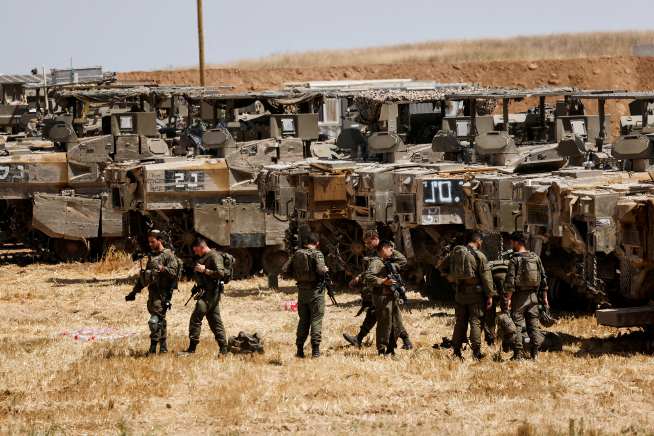 이스라엘 군인들이 13일(현지시간) 가자지구 접경 지역에서 대기하고 있다. [로이터] |