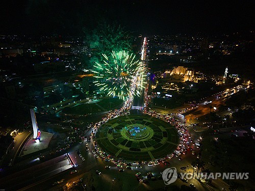 미 제재 해제 축하하는 시리아 다마스쿠스 |