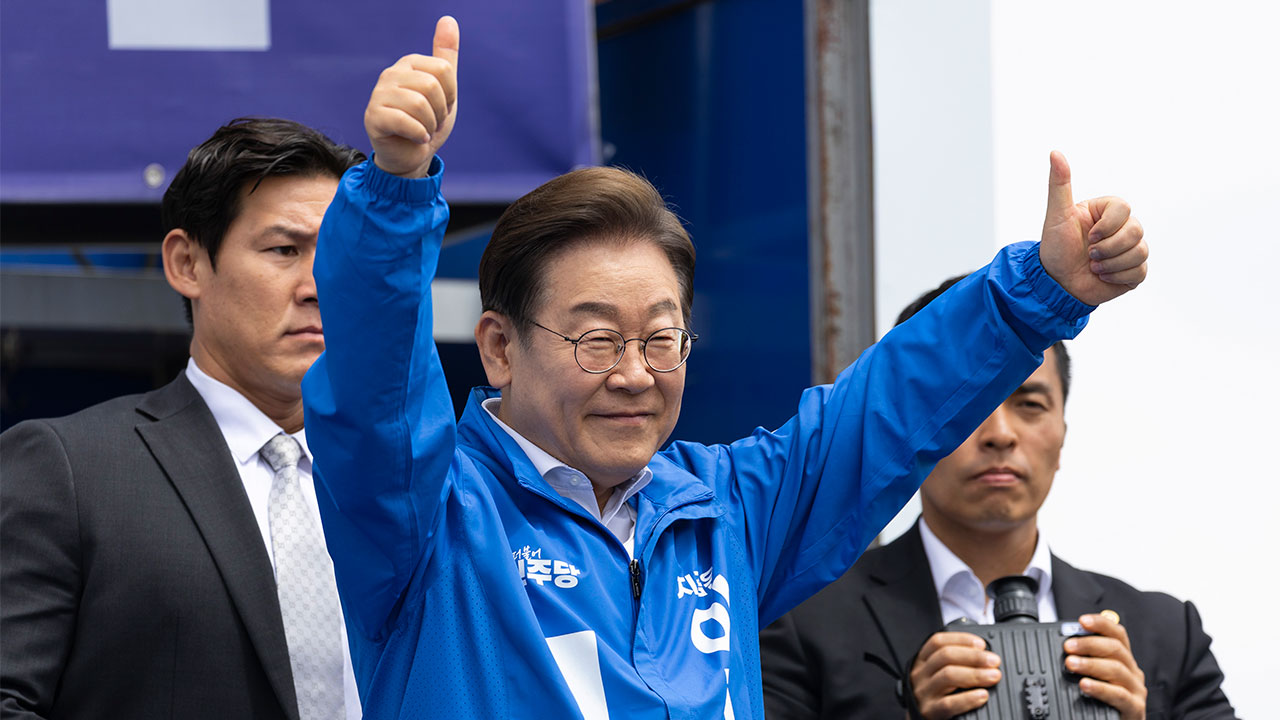 ▲ 더불어민주당 이재명 대선후보가 17일 전남 나주시 금성관 망화루 앞에서 열린 유세에 입장하며 시민들을 향해 인사하고 있다.