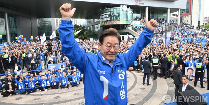 [광주=뉴스핌] 이형석 기자 = 이재명 더불어민주당 대선 후보가 17일 수많은 인파가 운집한 광주 서구 김대중컨벤션센터 광장에서 지지를 호소하고 있다. 2025.05.17 leehs@newspim.com |