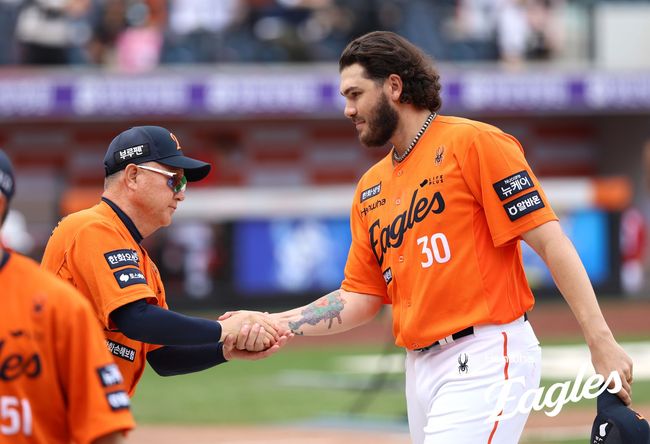 한화 코디 폰세가 17일 대전 SSG전 더블헤더 1차전 승리 후 김경문 감독과 악수를 하고 있다. /한화 이글스 제공 |