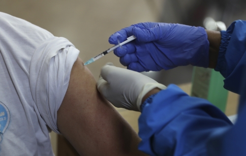 인도네시아 자카르타에 위치한 신종 코로나바이러스 감염증(코로나19) 백신 접종소에서 한 남성이 백신을 맞고 있다. 자카르타/AP연합뉴스 |
