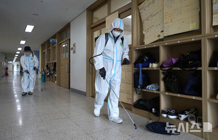 [대구=뉴시스] 이무열 기자 = 27일 오후 대구 달성군 강림 초등학교에서 대구학교안전공제회 관계자들이 코로나19 재확산 방지를 위해 방역작업을 하고 있다. 2024.08.27. lmy@newsis.com |