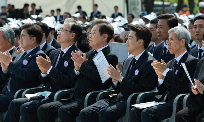 이재명 더불어민주당, 이준석 개혁신당 이준석, 권영국 민주노동당 대선 후보 등이 18일 광주광역시 북구 국립 5·18민주묘지에서 열린 5·18민주화운동 45주년 기념식에서 공연을 보고 있다.(사진=연합뉴스 제공) |