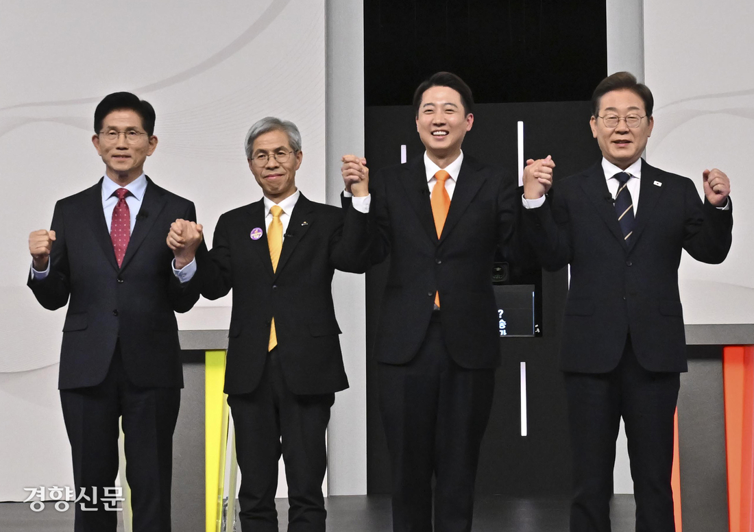 이재명 더불어민주당 후보, 이준석 개혁신당 후보, 권영국 민주노동당 후보, 김문수 국민의힘 후보(오른쪽부터)가 중앙선거방송토론위원회 주관으로 18일 서울 상암동 SBS 프리즘센터 스튜디오에서 열린 제21대 대선 1차 후보자 토론회에서 기념 촬영을 하고 있다. 국회사진기자단 |