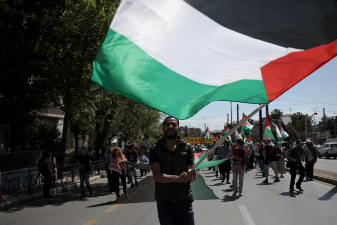 17일(현지시간) 이스라엘과 하마스 간 분쟁이 계속되는 가운데 독일 함부르크에서 이스라엘 반대 시위에서 한 친팔레스타인 시위대가 팻말을 들고 있다. (사진=로이터) |