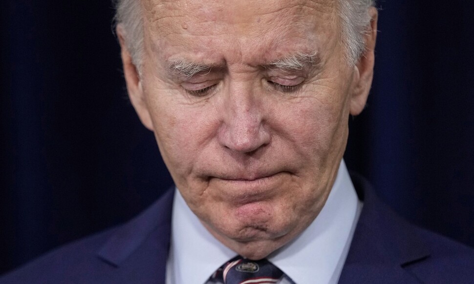 지난해 12월 29일 미국령 버진아일랜드 세인트크로이 크리스천스테드에서 조 바이든 대통령이 지미 카터 전 대통령의 별세에 대해 언급하며 말을 멈추고 있다. 크리스천스테드/AP 연합뉴스 |