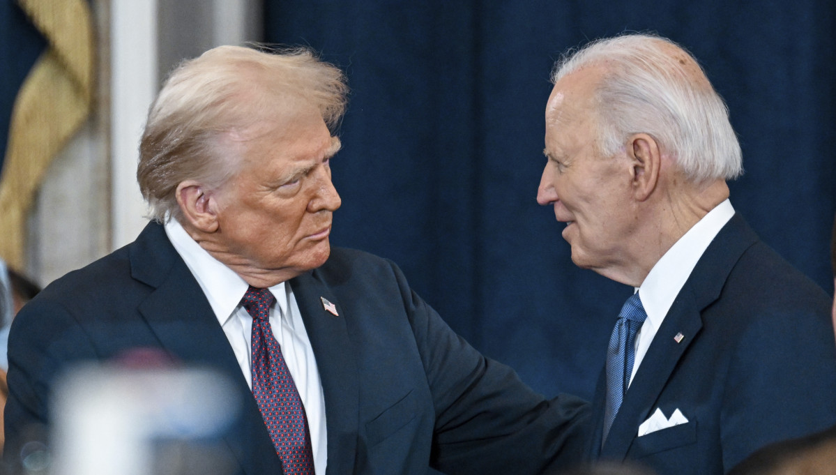 도널드 트럼프(왼쪽) 미국 대통령 당선인이 20일(현지 시간) 본인의 제47대 대통령 취임식이 열리는 미 연방의회 의사당 로툰다 홀에 입장해 조 바이든 대통령과 만나고 있다. 바이든 전 대통령이 전립선암 진단 소식을 전한 가운데 트럼프 대통령이 별도의 메시지를 내며 그를 위로 했다. |
