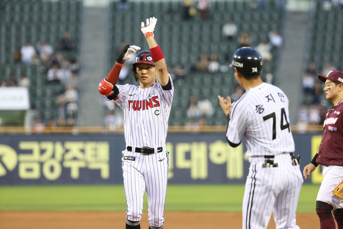 LG 문보경이 14일 서울 잠실구장에서 열린 2025 KBO리그 정규시즌 키움전서 안타를 친 후 세리머니하고 있다. 사진 | LG 트윈스 |