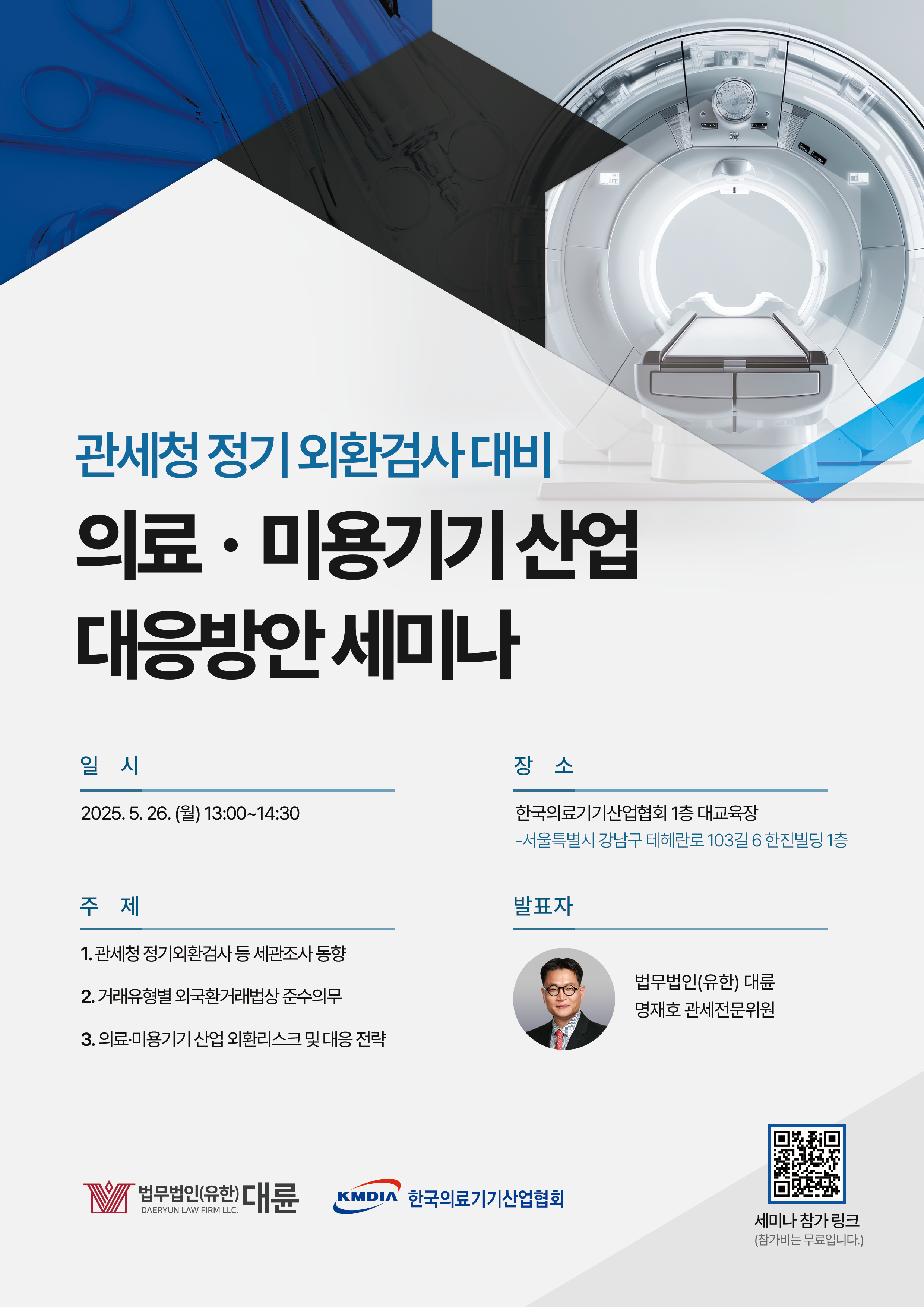 법무법인 대륜이 오는 26일 오후 1시 한국의료기기산업협회 교육장에서 의료·미용기기 등 수출입 기업을 대상으로 한 '정기 외환검사 제도 대응방안' 세미나를 개최한다고 19일 밝혔다.