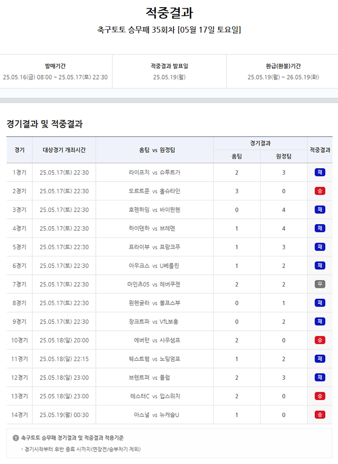 베트맨 5월19일(월) 해외 축구 14경기 대상 축구토토 승무패 35회차 적중 결과 발표