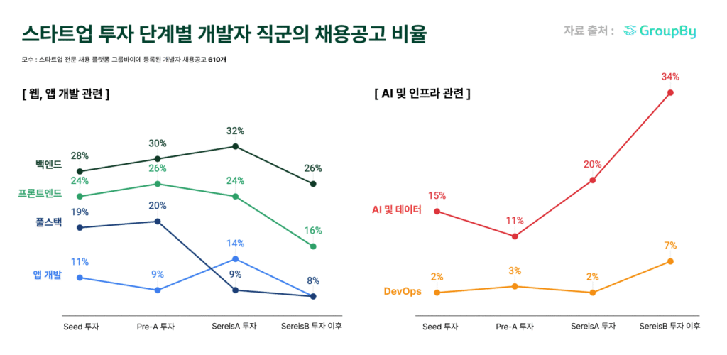 그룹바이가 610개 개발자 채용공고를 기업의 투자단계별로 분석한 결과, 직군별로 뚜렷한 패턴이 확인됐다.