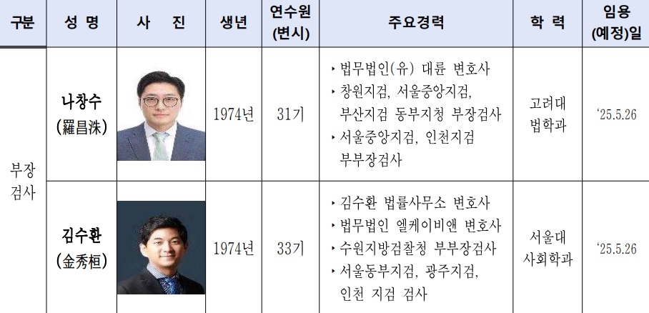 나 변호사와 김 변호사는 각각 13~15년에 달하는 검찰청 검사경력을 바탕으로 공수처 신규 부장검사에 임용된다. 원 실장은 군판사, 군검사 등 군 법무관으로 12년간 복무하면서 법무참모·인권·소송 등을 수행했다. 이 전 팀장은 경감 특채로, 국수본 중대범죄수사과 및 특별수사본부에서 특수 수사역량을 축적해왔다.