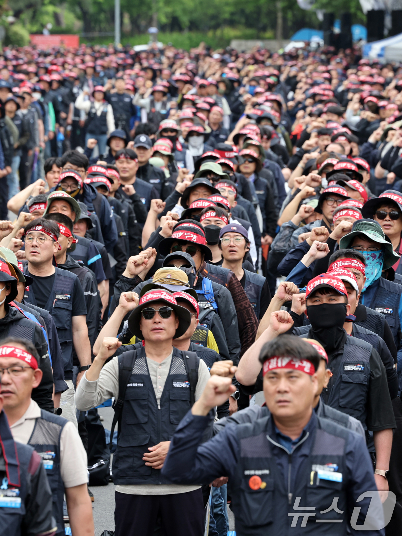 (서울=뉴스1) 황기선 기자 = 민주노총 화물연대본부 조합원들이 19일 오후 서울 영등포구 여의도 국회의사당역 앞에서 열린 '확대간부 결의대회'에서 민중의례를 하고 있다. 2025.5.19/뉴스1
