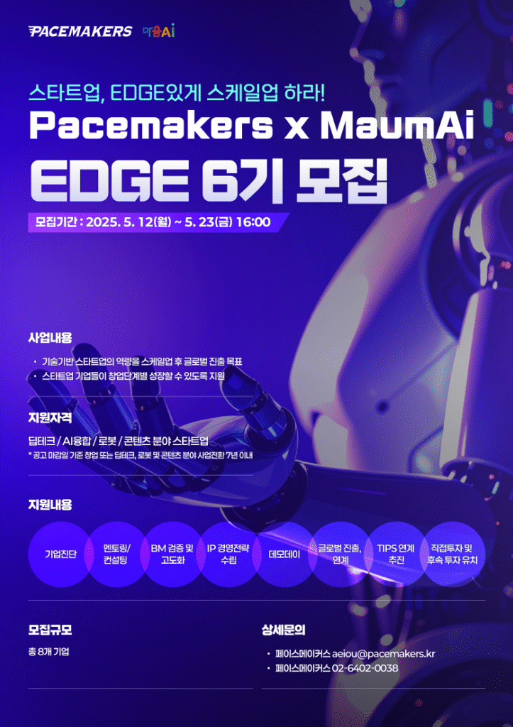 글로벌 딥테크 스케일업 액셀러레이터 페이스메이커스가 인공지능 전문기업 마음AI와 손잡고 'EDGE 6기' 프로그램에 참여할 스타트업을 모집한다. AI, 딥테크, 로봇, 콘텐츠 분야의 혁신 스타트업 8개사를 선정해 최대 3억원의 직접 투자와 글로벌 진출을 지원한다.