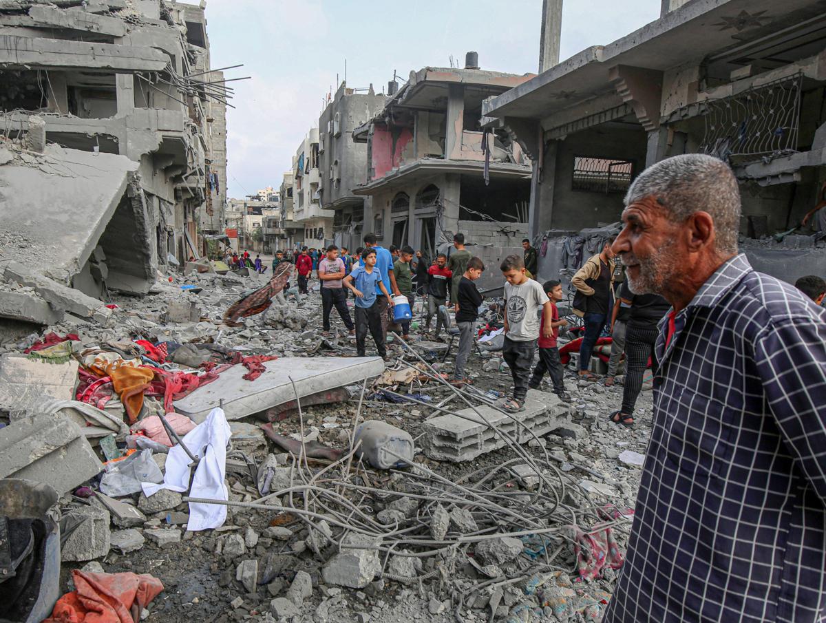 18일(현지 시간) 팔레스타인 가자지구 북부 자빌리아 난민캠프에서 주민들이 이스라엘 공습으로 무너진 주택 잔해 사이를 걷고 있다. 자빌리아=신화 뉴시스 |